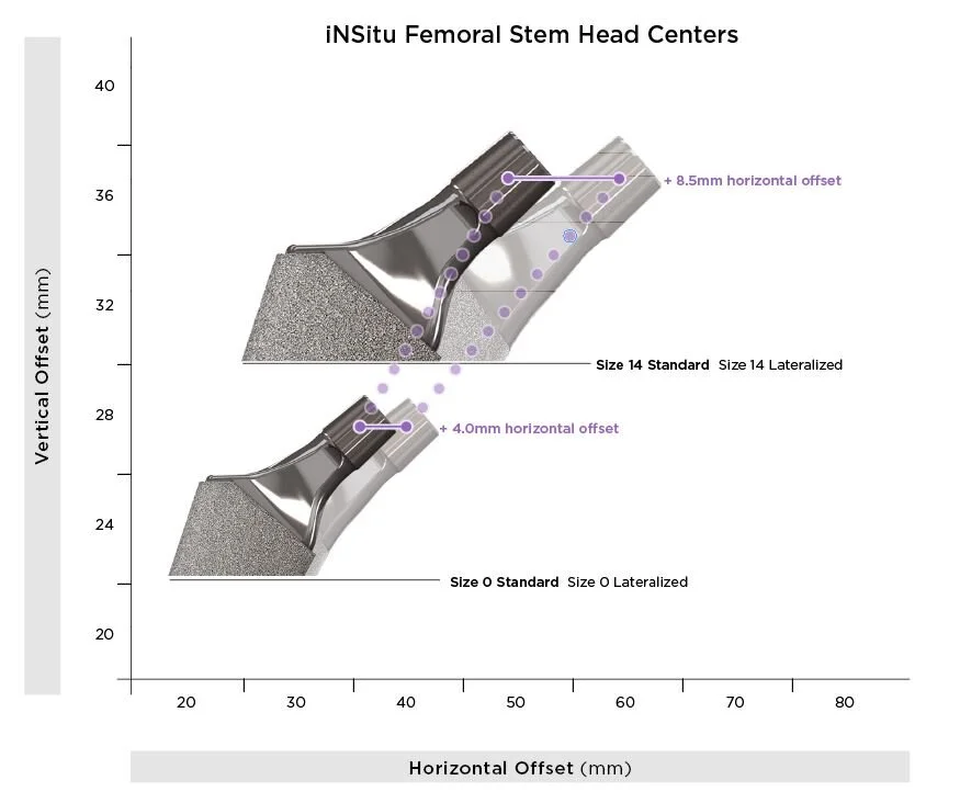 A lateralized version of each stem is available, providing a progressively greater horizontal offset with each size, while still maintaining leg length, vertical offset and neck angle. The stem architecture is designed for a more accurate match with anatomical variations and inconsistencies, for optimal biomechanical reconstruction.